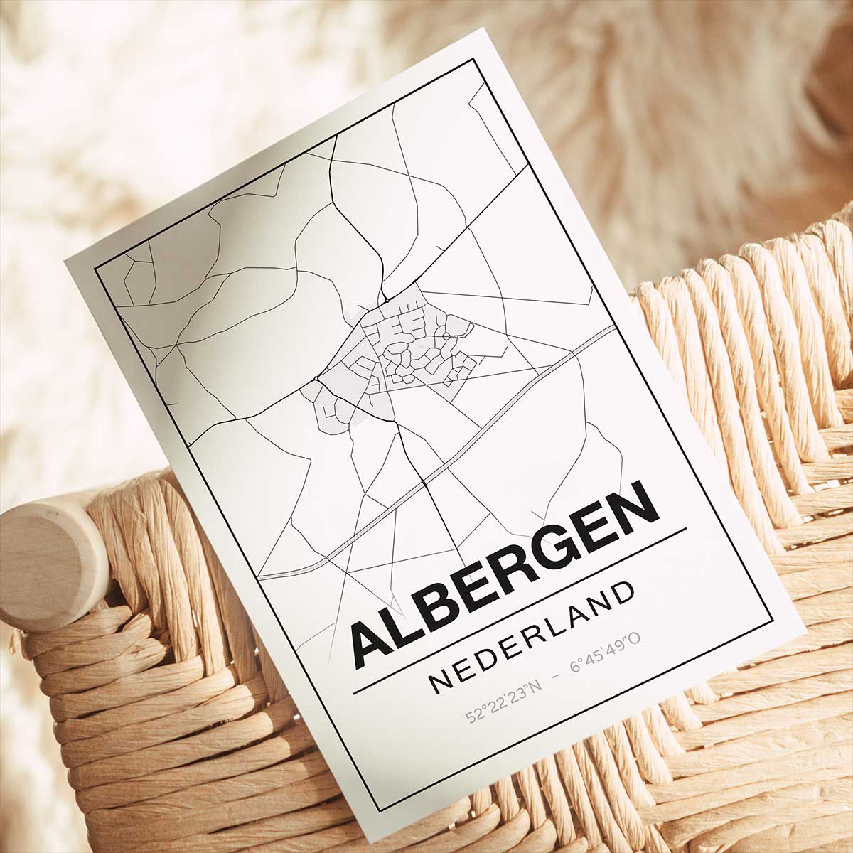Kom je uit of woon je in Albergen? Dan is deze stijlvolle plattegrond met de exacte coördinaten van Albergen precies iets voor jou! Je kunt de poster van Albergen – Overijssel bestellen in verschillende maten, met of zonder fotolijst, in dialect of met een markering op een bepaalde plek. Als cadeau is de plattegrond van Albergen ook een aanrader!