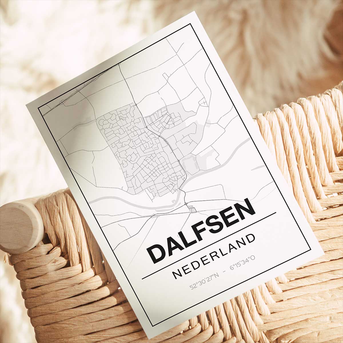 Kom je uit of woon je in Dalfsen? Dan is deze stijlvolle plattegrond met de exacte coördinaten van Dalfsen precies iets voor jou! Je kunt de poster van Dalfsen – Overijssel bestellen in verschillende maten, met of zonder fotolijst, in dialect of met een markering op een bepaalde plek. Als cadeau is de plattegrond van Dalfsen ook een aanrader!