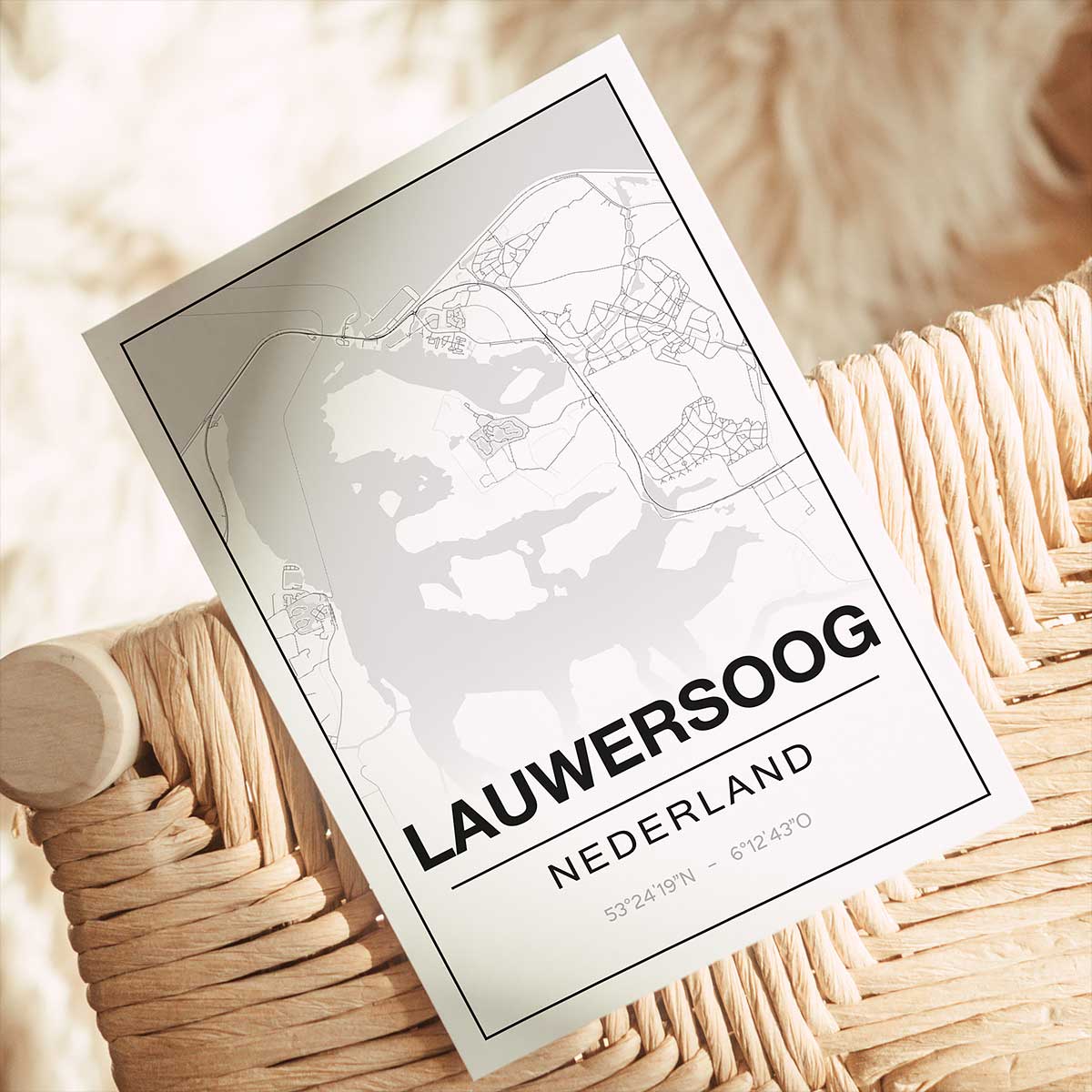 Kom je uit of woon je in Lauwersoog? Dan is deze stijlvolle plattegrond met de exacte coördinaten van Lauwersoog precies iets voor jou! Je kunt de poster van Lauwersoog – Groningen bestellen in verschillende maten, met of zonder fotolijst, in dialect of met een markering op een bepaalde plek. Als cadeau is de plattegrond van Lauwersoog ook een aanrader!