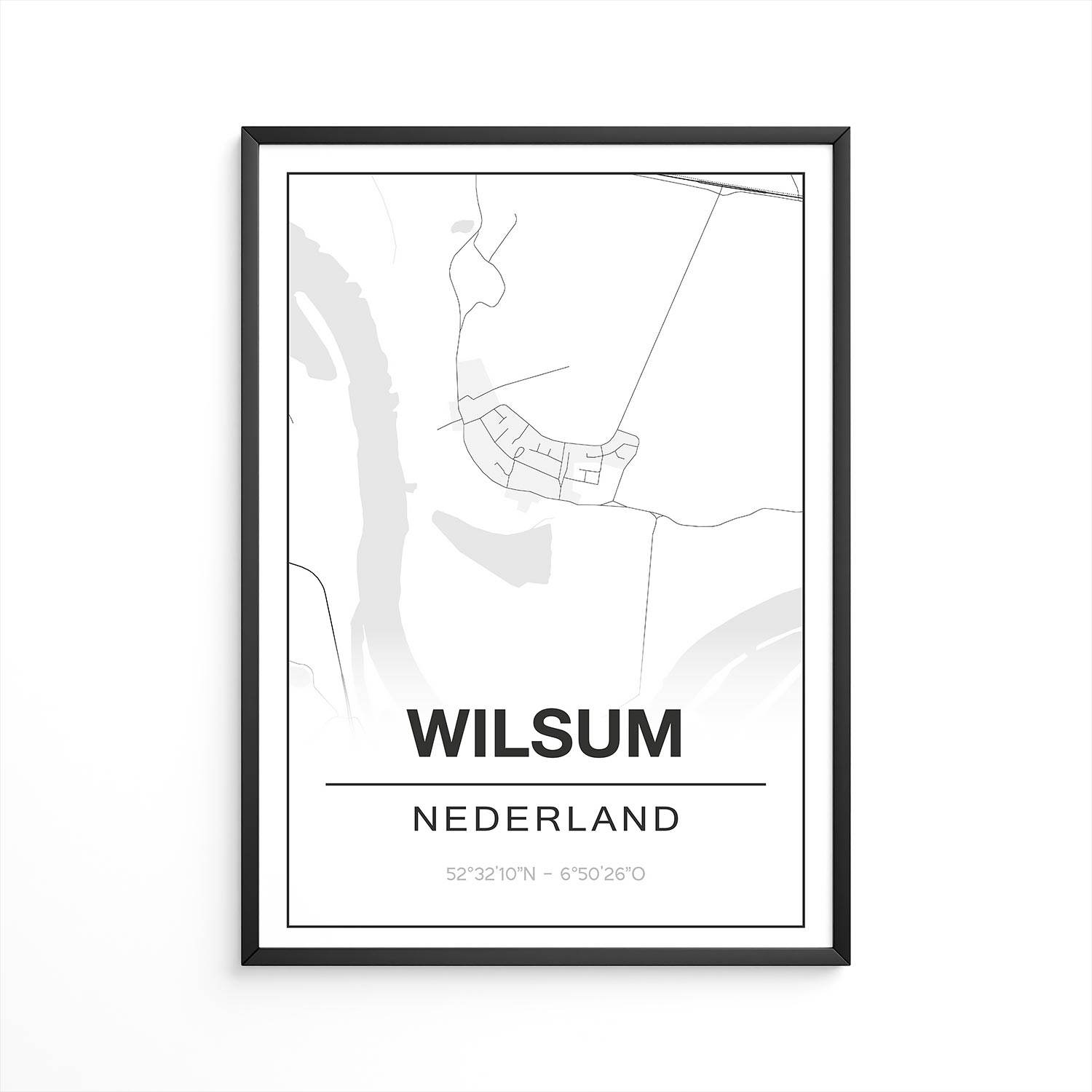 Je kunt samen met de poster van Winde – Drenthe ook direct een fotolijst bestellen. De houten fotolijsten zijn beschikbaar in zwart, wit en eikenlook. De rand van de fotolijst is 15mm breed. Een eigen onderschrijft en schrijfwijze (b.v. dialect) is ook mogelijk. Ook een hartje of huisje op een bepaalde plek is geen probleem, zonder extra kosten.
