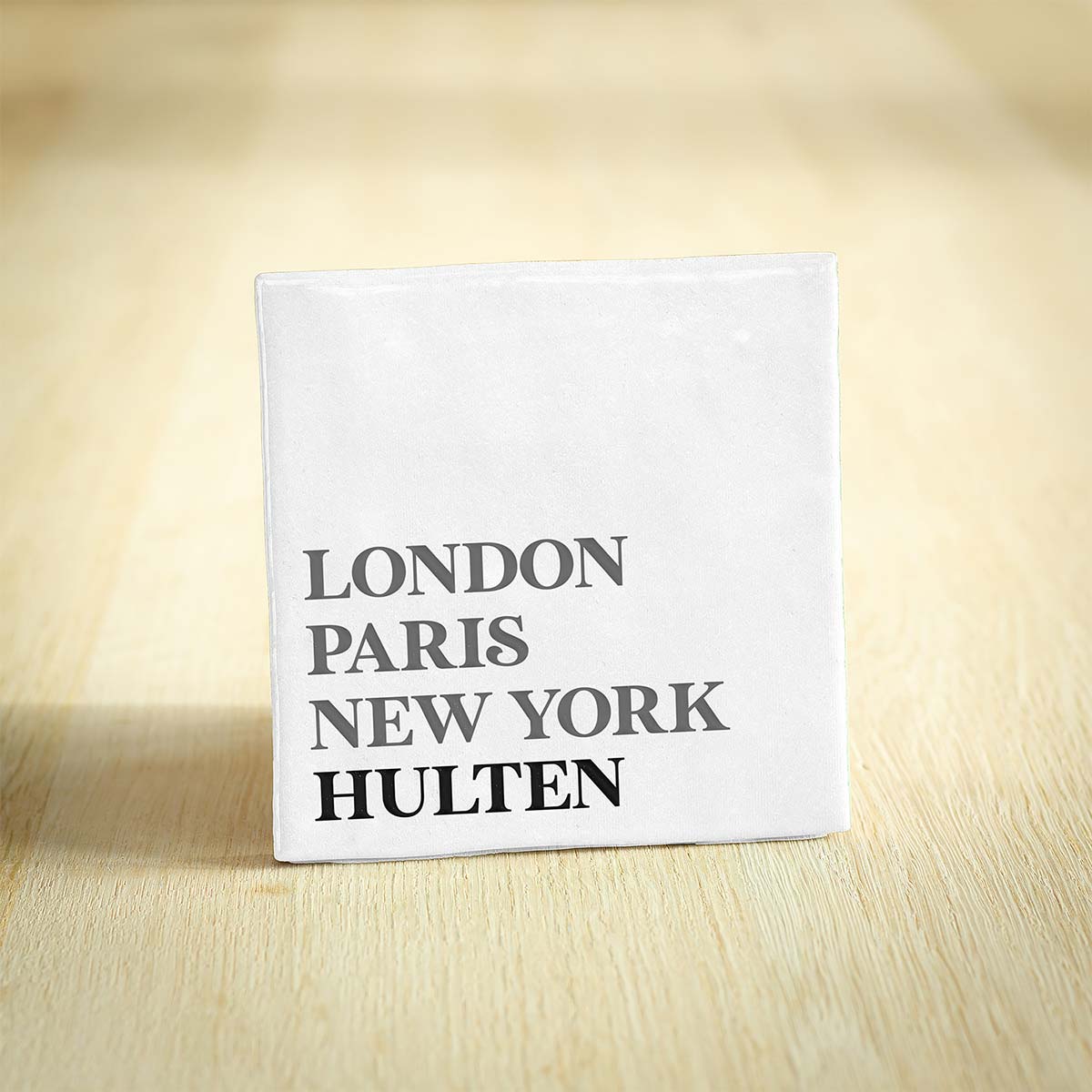 Tegeltje van Hulst – Overijssel. Een hip en modern keramieken tegeltje van Hulst (Overijssel) samen met London, Paris en New York. Dit tegeltje van 10x10cm is een stijlvolle aanvulling voor je interieur. Ook erg leuk als cadeau bij een verhuizing vanuit of naar Hulst!