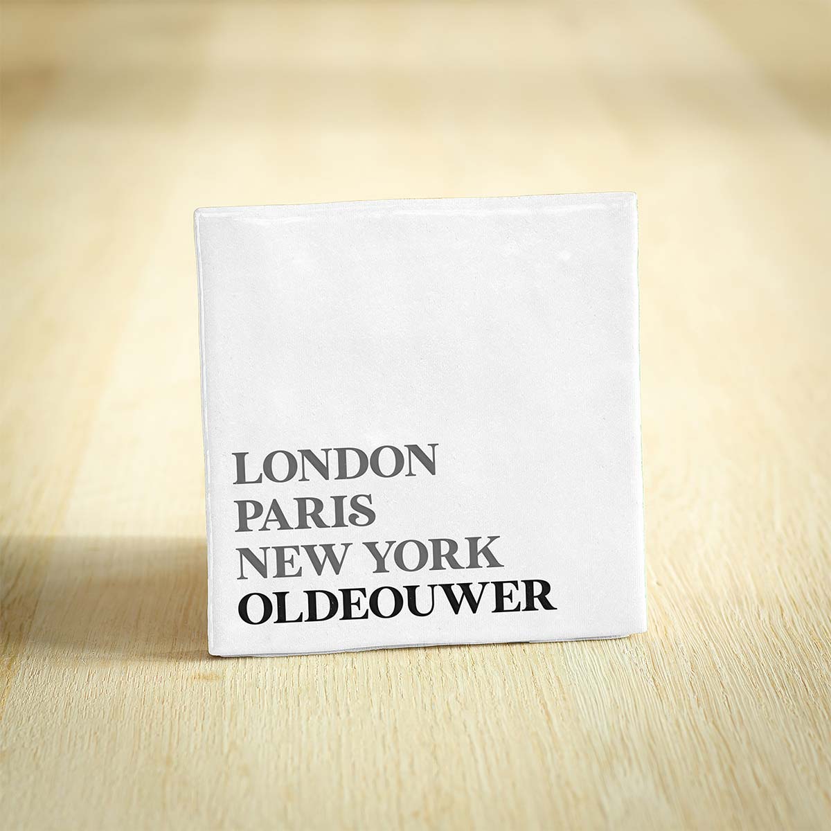 Tegeltje van Oldetrijne – Friesland. Een hip en modern keramieken tegeltje van Oldetrijne (Friesland) samen met London, Paris en New York. Dit tegeltje van 10x10cm is een stijlvolle aanvulling voor je interieur. Ook erg leuk als cadeau bij een verhuizing vanuit of naar Oldetrijne!