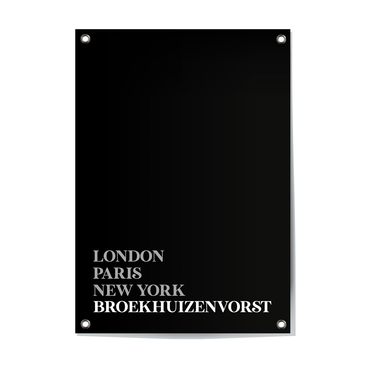 Tuinposter van Broekhuizenvorst – Limburg. Deze moderne tuinposter van Broekhuizenvorst (Limburg) samen met London, Paris en New York is een stijlvolle aanvulling voor je tuin! De tuinposter (60x80cm) is weerbestendig en voorzien van 4 ringen voor eenvoudige montage.