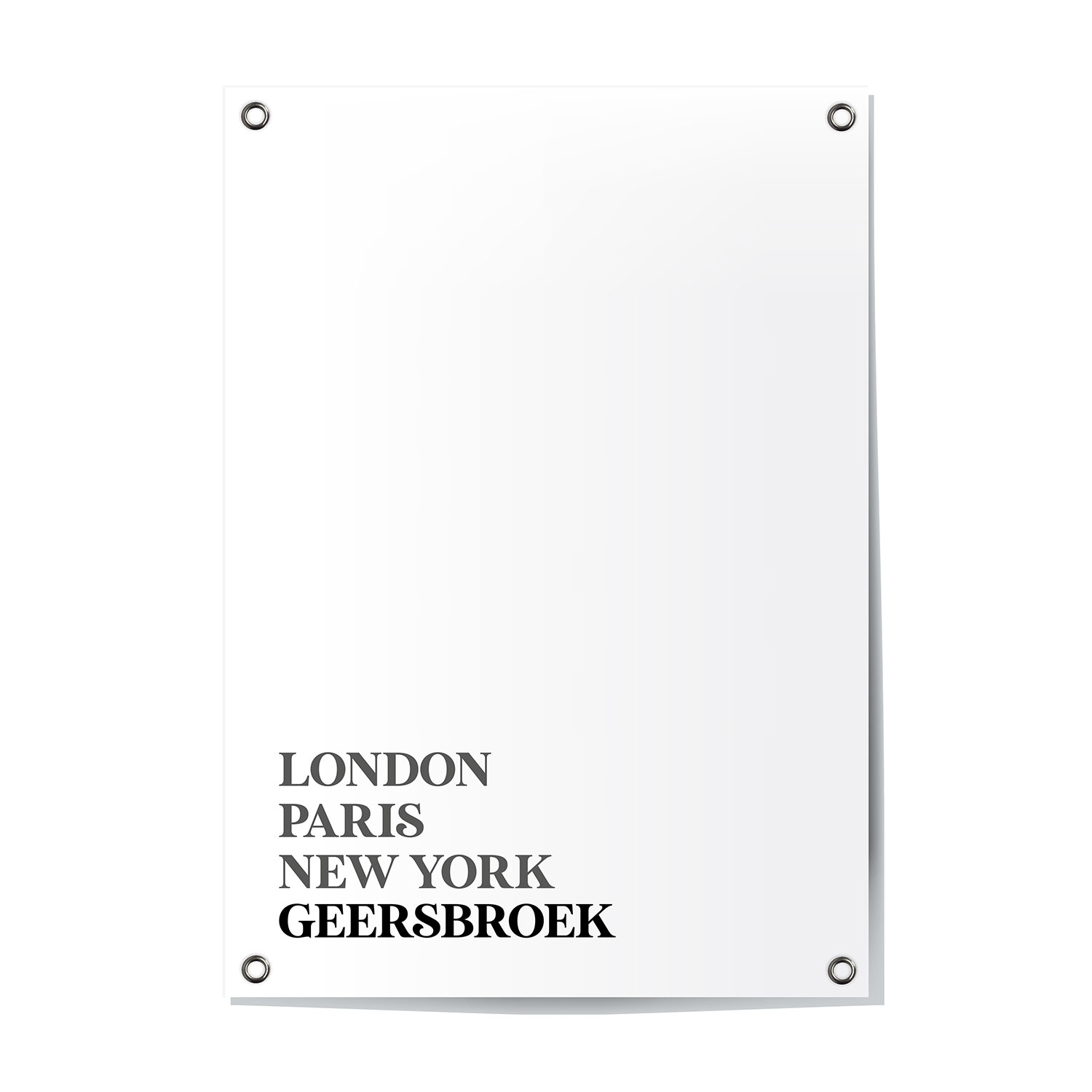 Tuinposter van Geersdijk – Zeeland. Deze moderne tuinposter van Geersdijk (Zeeland) samen met London, Paris en New York is een stijlvolle aanvulling voor je tuin! De tuinposter (60x80cm) is weerbestendig en voorzien van 4 ringen voor eenvoudige montage.